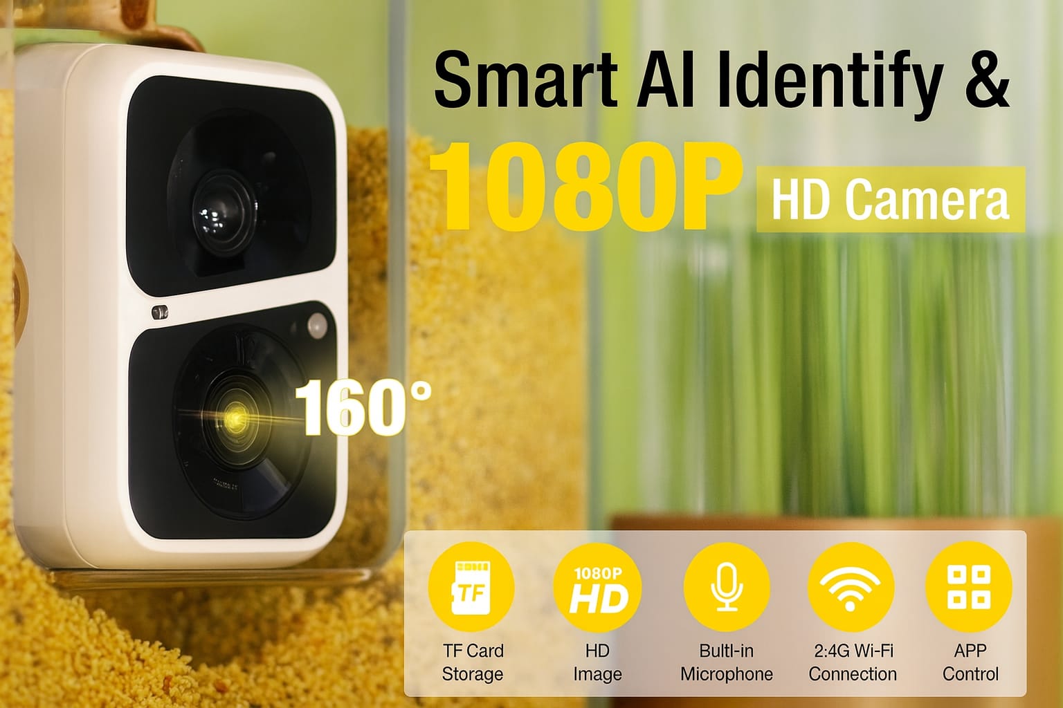 1.5L hopper reduces refills; IP65 weather-resistant build; optional AI species ID in the app.